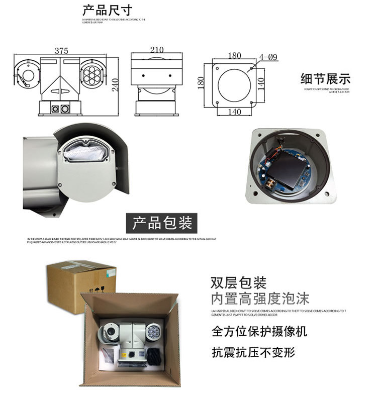 激光云台:采用进口808nm激光器,实现同步变焦,角度可调或根据摄像机倍数自动调节,激光光斑角度1°到50°,激光器3.5w、6w、10w以及3公里可选;